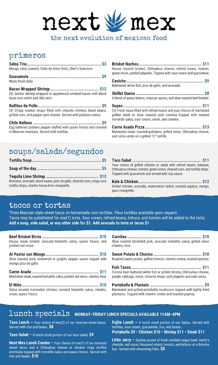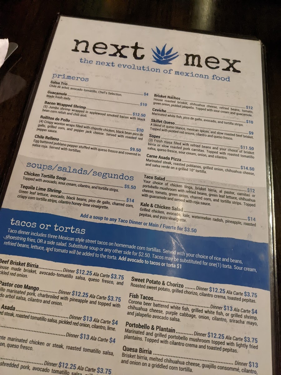 The atmosphere encourages a relaxed dining experience, with ample outdoor seating perfect for socializing. Customer service shines, as servers are attentive and knowledgeable, catering to dietary needs with a smile. While some reviews mention inconsistencies in dish sizes and freshness, the overall enthusiasm for the food and ambiance at Next Mex is palpable. For those seeking a delightful culinary adventure, Next Mex promises to deliver a memorable twist on traditional fare.