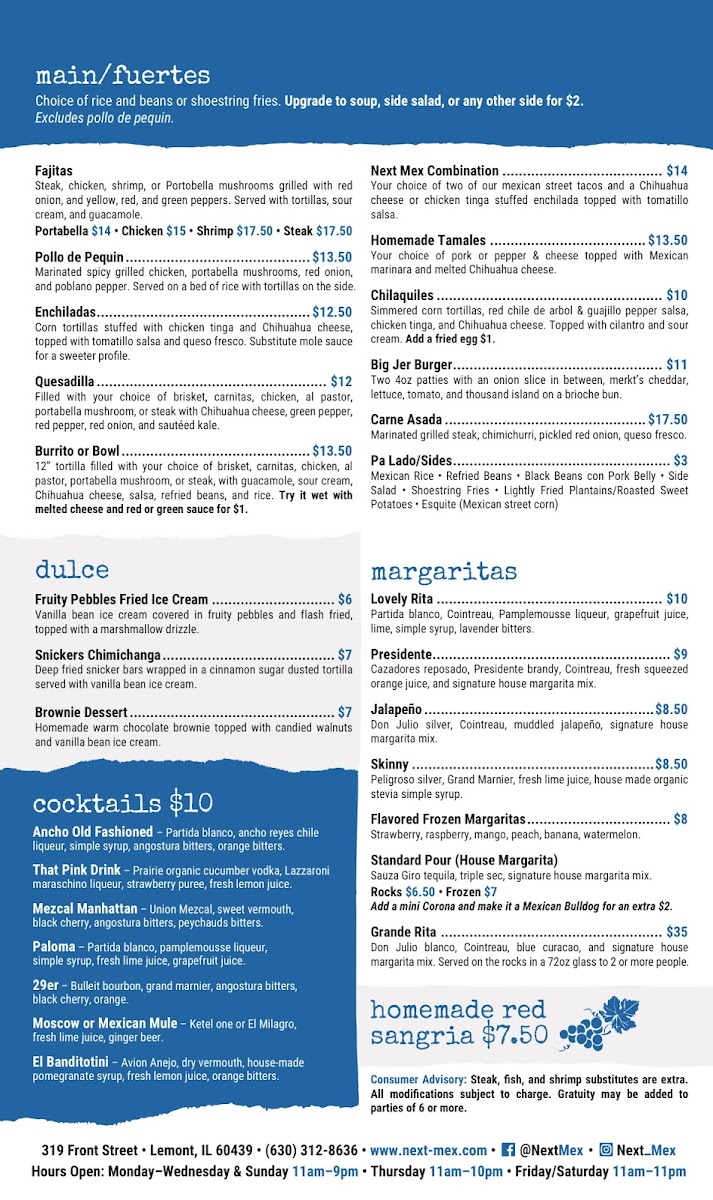 Welcome to Next Mex, a vibrant haven for lovers of Mexican cuisine located in Lemont, Illinois. Nestled at 319 Front St, this establishment stands out for its commitment to freshness and flavor, with homemade tortillas that patrons rave about. The menu boasts highlights such as the Corona beer battered taco and al pastor, both delivering an authentic taste experience. Diners like Alexis Piccirillo appreciate the balanced and refreshing margaritas, including the unique jalapeño margarita.